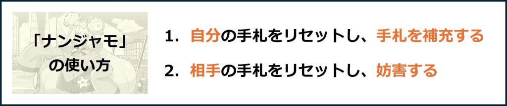 このように、「ナンジャモ」には、主に序盤に使って自分の手札を増やす使い方と、主に終盤に使って相手を妨害する使い方の二つがあります。