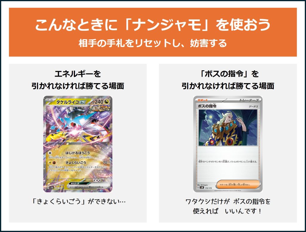 また、「ボスの指令」を引かれることがなければ勝てるような場面もあり得ます。そのような場面でも、「ナンジャモ」により相手が「ボスの指令」を引く確率を最大限下げることができます。