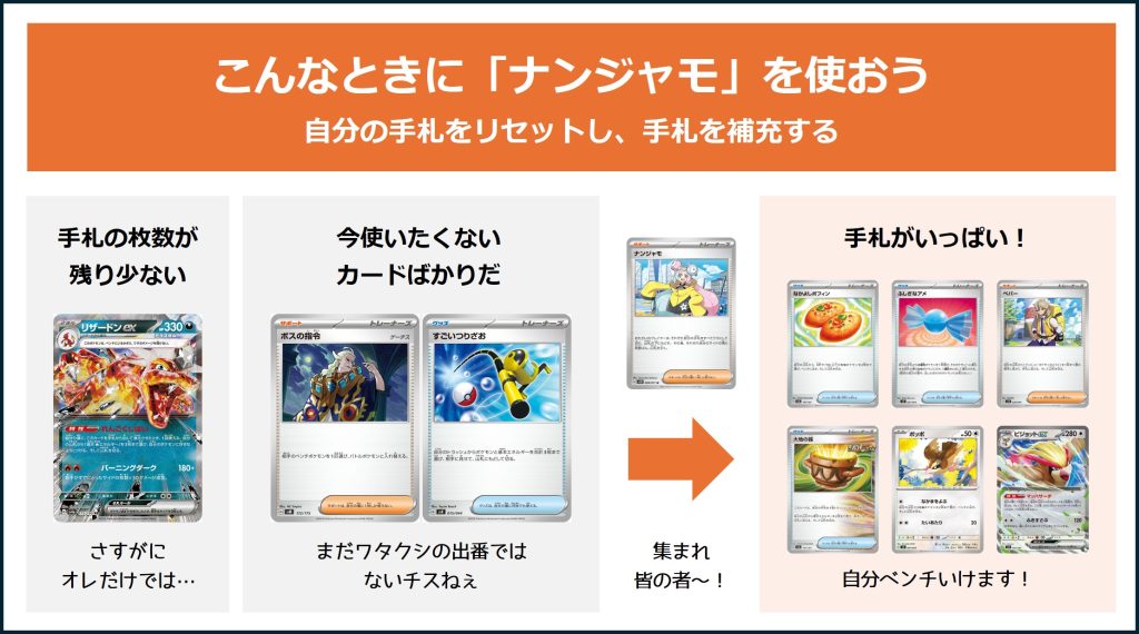 序盤に使った場合、「ナンジャモ」に比べると手札を補充できる枚数が少なくなりますが、その分、序盤から相手の行動を妨害していくことができます。終盤に使った場合は、「ナンジャモ」に比べ相手を妨害する効果が弱くなりますが、自分の手札は補充しやすくなります。